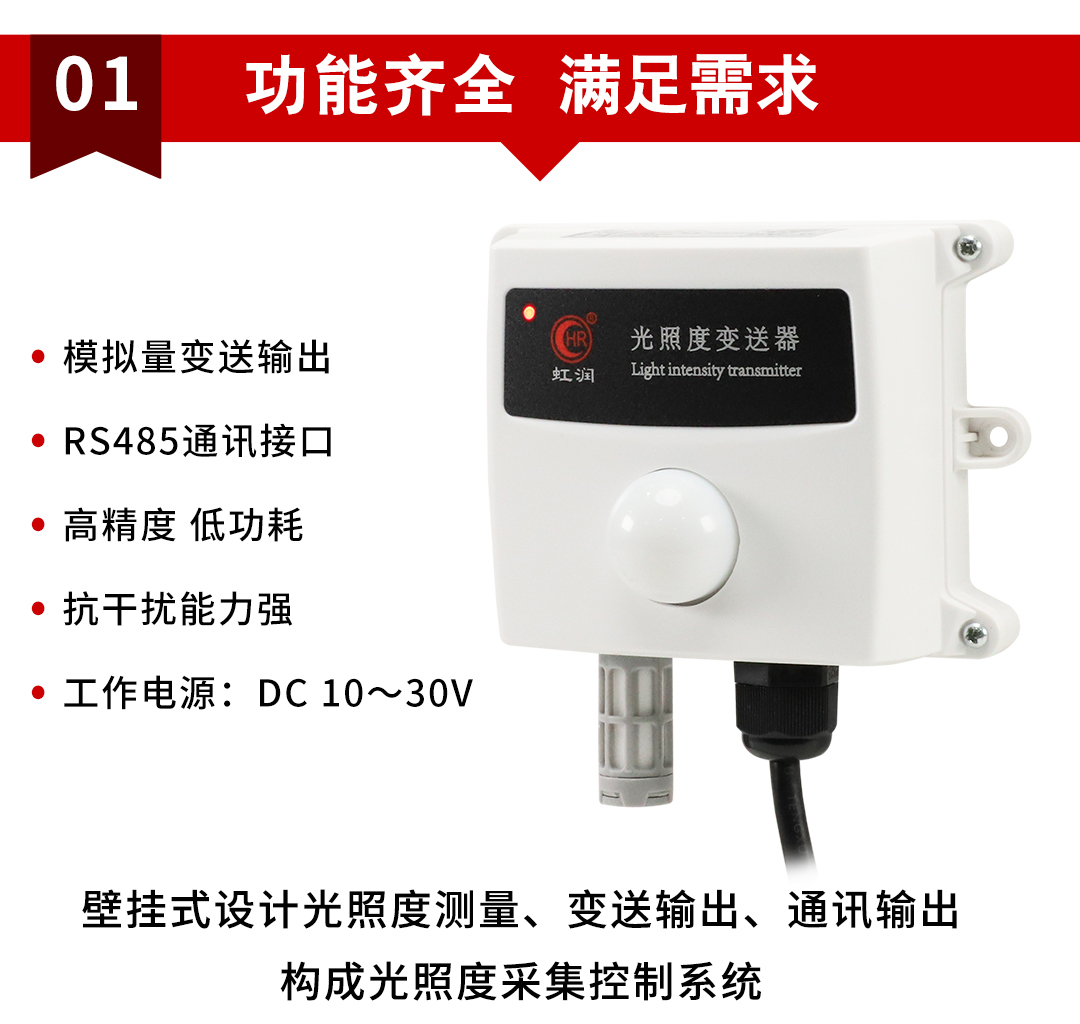 虹潤公司是專業(yè)生產環(huán)境監(jiān)測儀表的國家專精特新“小巨人”企業(yè)。生產的光照度變送器,具有高精度感光傳感器,響應靈敏,準確度高,低功耗,模擬量變送輸出或RS485通訊等特點。產品獲得一種農業(yè)監(jiān)控變送器、一種儀表電源等2項實用新型專利,主持起草現(xiàn)場設備集成等5項智能制造國家標準,以及現(xiàn)場設備工具(FDT)接口規(guī)范、物聯(lián)網(wǎng)總體技術智能傳感器特性與分類等2項國家標準,參與國際5G標準制定,取得農業(yè)監(jiān)測變送器等3項相關軟件著作權。產品廣泛應用于溫室大棚、花卉養(yǎng)殖、科研實驗、智能樓宇、戶外照明等環(huán)境場合對光照度的檢測。