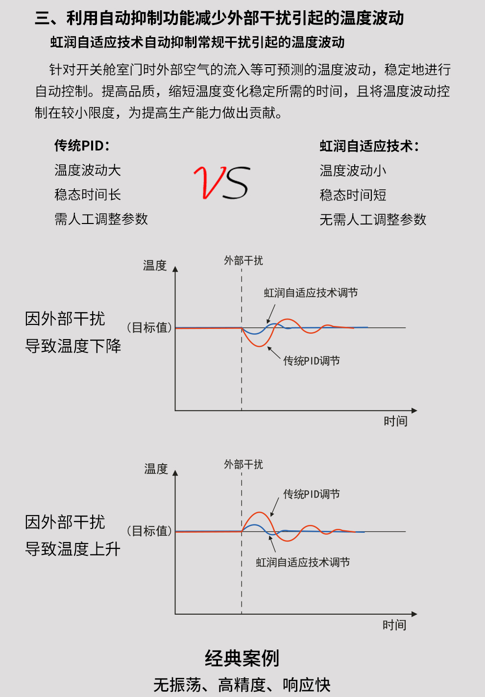 虹潤公司是專業(yè)生產(chǎn)溫控器的國家專精特新“小巨人”企業(yè)。生產(chǎn)的傻瓜式智能溫控器,具有傻瓜式操作,真正人工智能算式,無需人工整定參數(shù),控制精度可達±0.1°C,高抗干擾等特點。產(chǎn)品獲得模糊PID控制儀及控制方法、人工智能調(diào)節(jié)器、智能化控制器、移相觸發(fā)控制器、閥門自動手動無擾動操作控制方法及裝置等5項國家發(fā)明專利,主持起草工業(yè)過程控制系統(tǒng)用模擬輸入兩位或多位輸出儀表、物聯(lián)網(wǎng)智能溫度儀表通用技術(shù)條件、工業(yè)過程測量和控制系統(tǒng)用智能調(diào)節(jié)器等3項國家標(biāo)準(zhǔn),以及通信系統(tǒng)多通道數(shù)據(jù)采集控制終端規(guī)范軍用標(biāo)準(zhǔn),參與國際5G標(biāo)準(zhǔn)制定,取得傻瓜式模糊PID調(diào)節(jié)儀等3項相關(guān)軟件著作權(quán)。產(chǎn)品廣泛應(yīng)用于電力、石化,冶金、制藥、食品等幾乎所有工業(yè)現(xiàn)場,實現(xiàn)精準(zhǔn)控溫,保障生產(chǎn)安全與質(zhì)量。