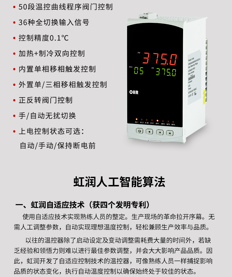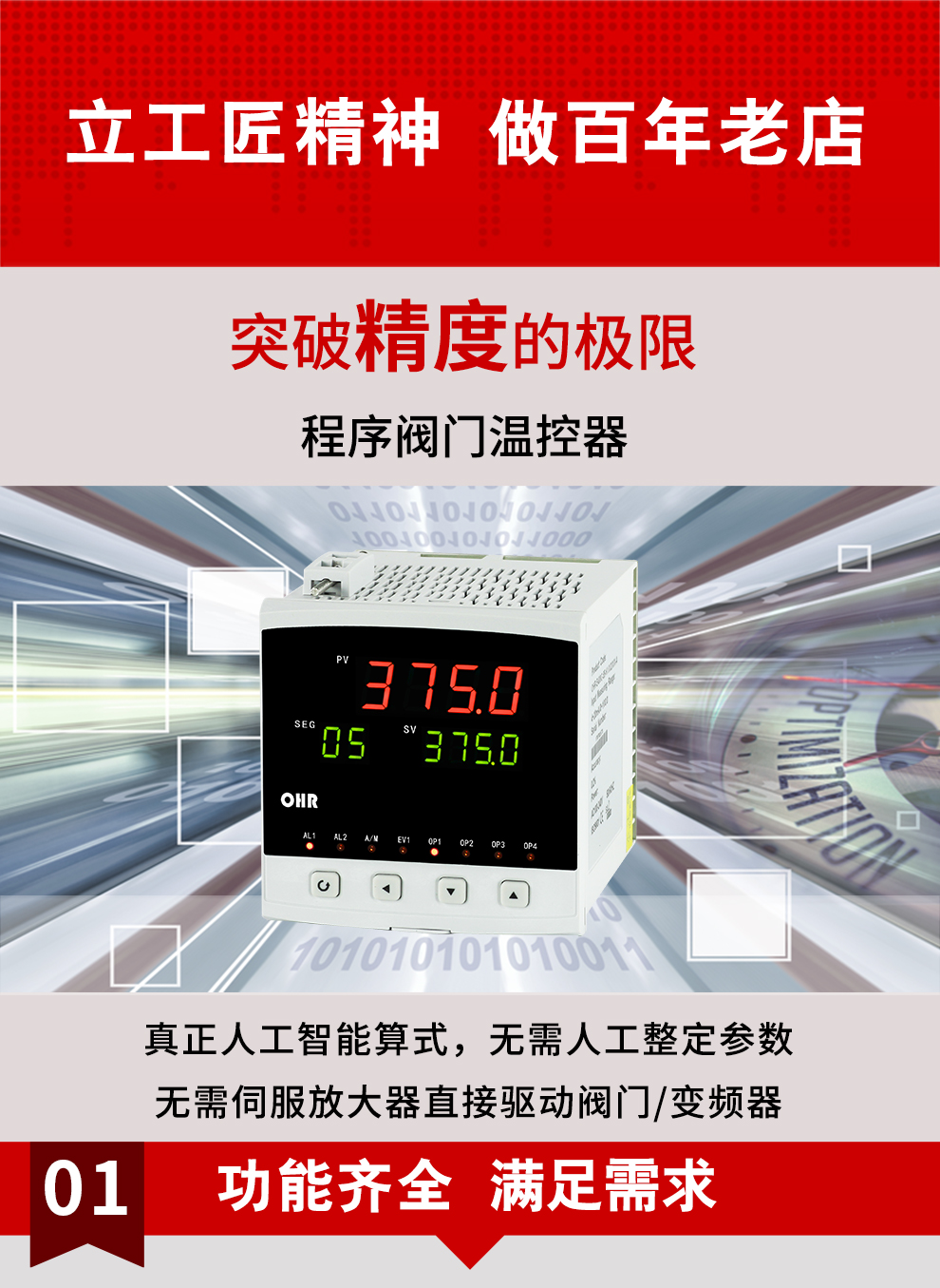 OHR-E401系列程序閥門溫控器/調(diào)節(jié)儀采用真正的人工智能算式,儀表啟動(dòng)自整定功能,可以根據(jù)被控對(duì)象的特性,自動(dòng)尋找最優(yōu)參數(shù)以達(dá)到很好的控制效果,無(wú)需人工整定參數(shù)??販鼐然具_(dá)±0.1℃,無(wú)超調(diào)、欠調(diào),達(dá)國(guó)際先進(jìn)水平。