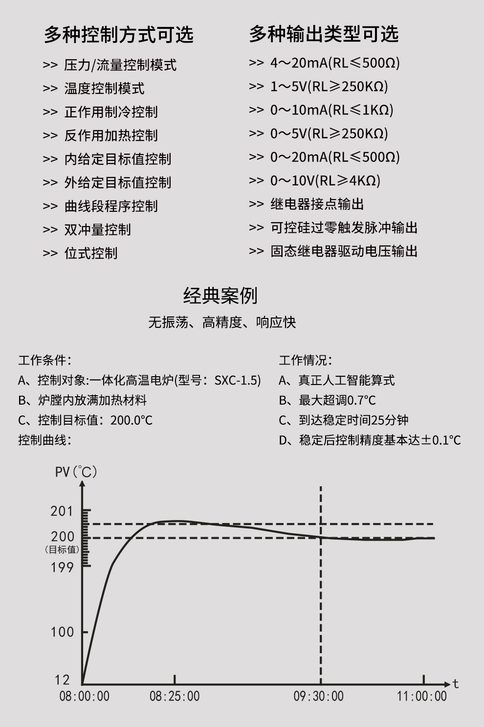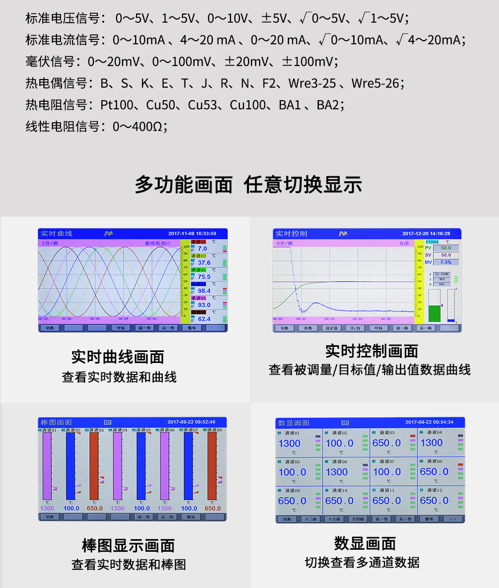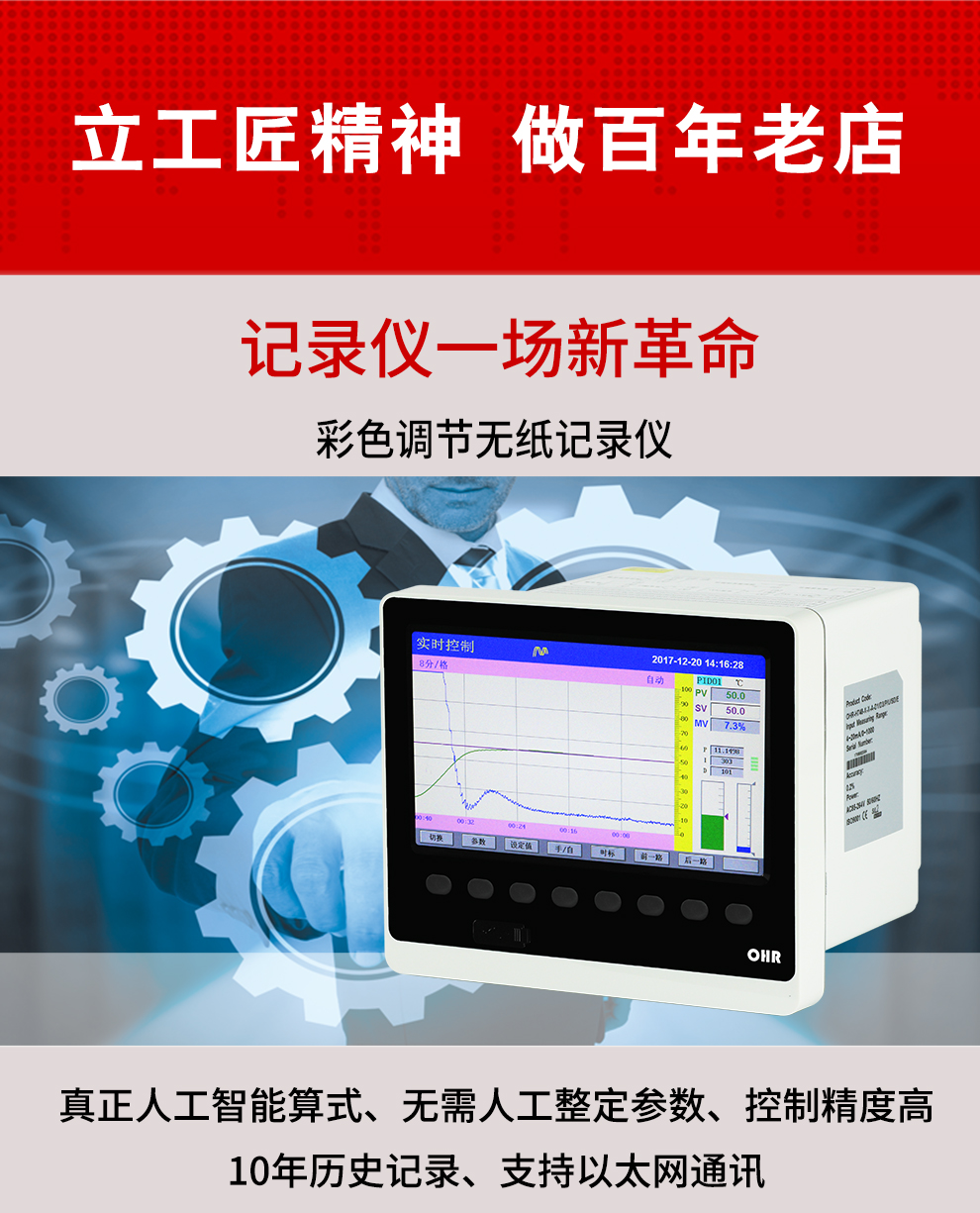 OHR-H300系列彩色調(diào)節(jié)無紙記錄儀采用真正的人工智能算式,儀表啟動自整定功能,可根據(jù)被控對象的特性,自動尋找最優(yōu)參數(shù)以達到很好的控制效果,無需人工整定參數(shù)。控溫精度基本達±0.1℃,無超調(diào)、欠調(diào),達國際先進水平。24路萬能輸入(可組態(tài)選擇輸入:標準電壓、標準電流、熱電偶、熱電阻、毫伏等)其中可帶8路控制輸入。