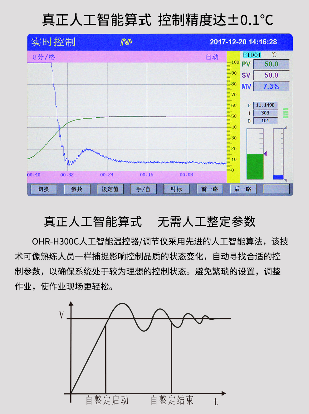 OHR-H300C系列觸摸式溫控器采用真正的人工智能算式,儀表啟動(dòng)自整定功能,可以根據(jù)被控對(duì)象的特性,自動(dòng)尋找最優(yōu)參數(shù)以達(dá)到很好的控制效果,無需人工整定參數(shù)。控溫精度基本達(dá)±0.1℃,無超調(diào)、欠調(diào),達(dá)國(guó)際先進(jìn)水平。24路萬能輸入(可組態(tài)選擇輸入:標(biāo)準(zhǔn)電壓、標(biāo)準(zhǔn)電流、熱電偶、熱電阻、毫伏等)其中可帶8路控制輸入。