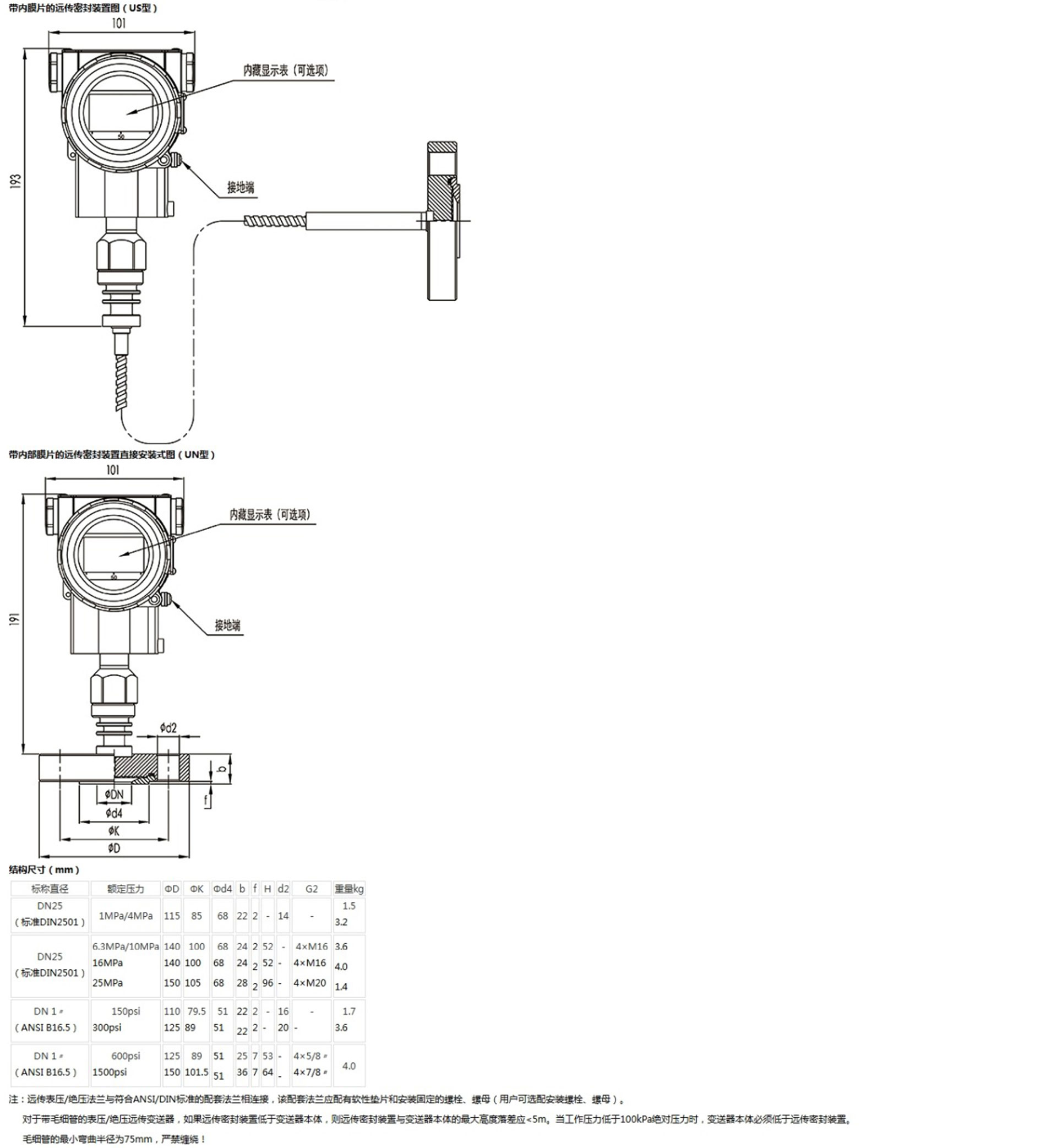 該產(chǎn)品用于測量液體、氣體或蒸汽的液位、密度、壓力,將其轉(zhuǎn)變成4~20mA (HART)電流輸出信號,可通過RST375手持終端對它們進行參數(shù)設定、過程監(jiān)控等。測量范圍(未遷移時)為0-6kPa~25MPa,液位法蘭的額定壓力分別為:1.6/4MPa、6.4MPa、10MPa、150psi、300psi或600psi。